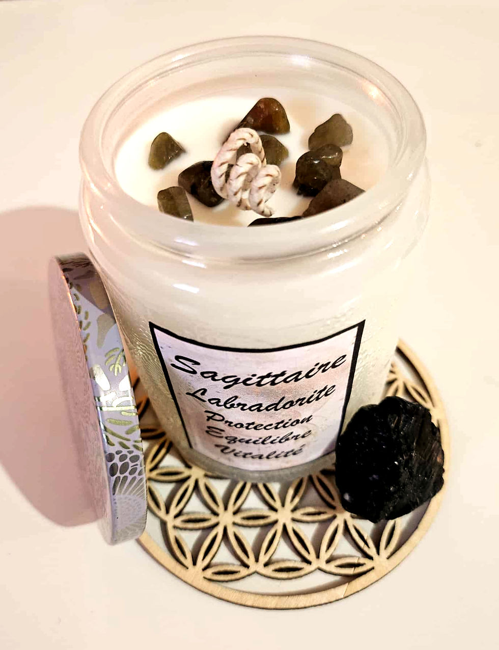 Vous pourrez trouver une bougie parfaite pour un moment cocooning specifiquement créer en fonction de votre signe astrologique et les pierres de lithotérapie qui y seront incorporée